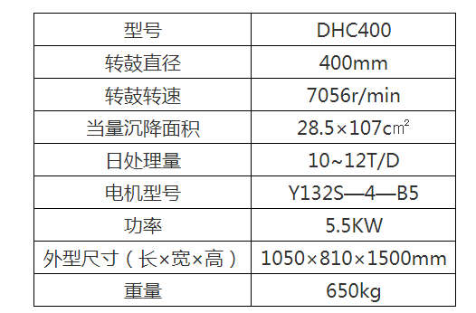 DHC400型碟式分離機設(shè)備主要參數(shù)為: