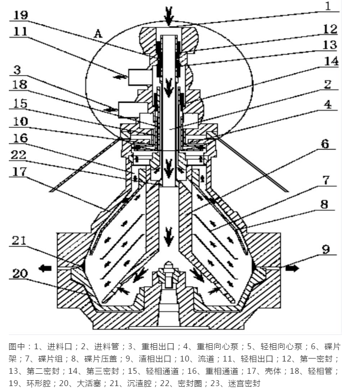 用于液液分別時(shí),乳濁液經(jīng)碟片束上的進(jìn)料孔進(jìn)入各碟片空地,按密度不同分為重液和輕液,重液沿碟片內(nèi)表面向轉(zhuǎn)鼓壁活動(dòng),輕液向中心活動(dòng),經(jīng)溢流口和向心泵分別排出。