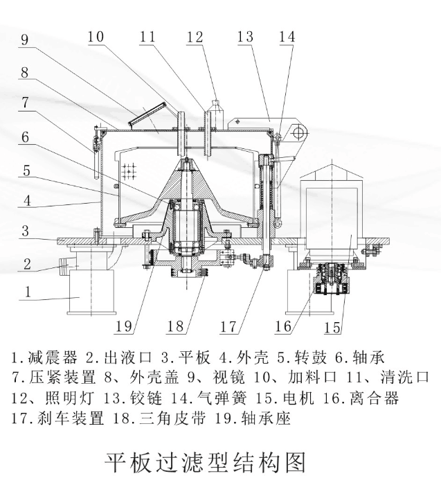 二、工作原理:待分離的物料經(jīng)進(jìn)料管進(jìn)入高速旋轉(zhuǎn)的離心機(jī)轉(zhuǎn)鼓內(nèi),在離心力作用下,液體穿過(guò)濾布及轉(zhuǎn)鼓上的濾孔,被甩到機(jī)殼內(nèi)壁經(jīng)過(guò)出液管排出,固相顆粒則被截留在轉(zhuǎn)鼓內(nèi),從而實(shí)現(xiàn)固液分離。
